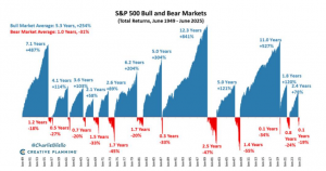 En esos setenta y cinco años hemos vivido doce periodos alcistas y doce bajistas. Los primeros,