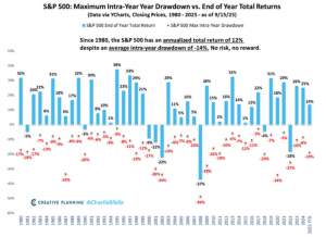 retorno generado por el S&P 500 cada año desde 1980 (barras azules) y la máxima caída anual